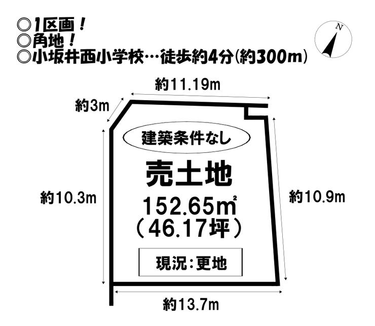 | 土地面積 | 公152.65㎡(46.17坪) | 接道 | 北西側(公道)幅 約5.4m 間口 約7.70m 南西側幅 約6.0m 間口 約10.30m |
